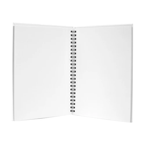 Cuaderno Ecológico blanco de Croquis, con Tapas Duras de Cartón Reciclado 650gsm, 80 hojas interiores prepicadas blancas de papel reciclado y anillado metálico doble cero. Presentación en bolsa plástica OPP transparente.