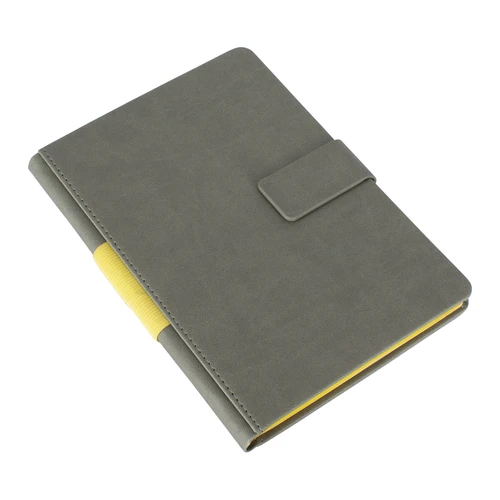 Cuaderno tamaño A5, con tapas duras forradas en PU gris, con cierre hebilla imantada, con 96 hojas amarillas lineadas de 80 gsm. Contiene detalles de color en lomo de hojas y porta-bolígrafo elasticado.