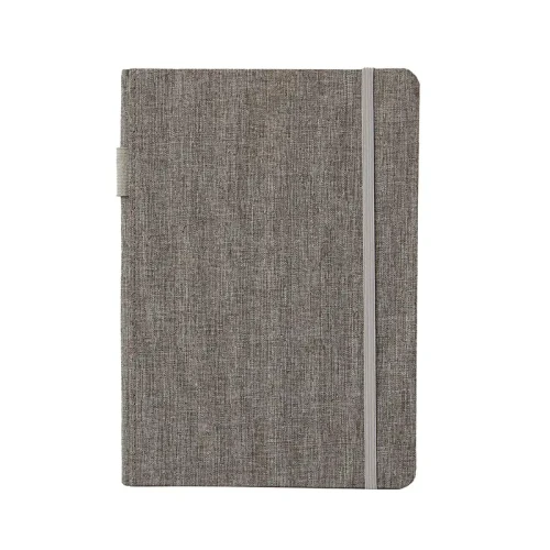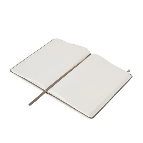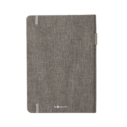 Cuaderno ecológico de tapa dura fabricado en RPET reciclado. Cuenta con 96 hojas lisas color marfil de papel de piedra, de escritura suave, más duradero y resistente que el papel tradicional. Cuenta con banda elástica de 6 mm en la tapa, porta bolígrafo elástico de 1,5 cm y cinta señaladora. Es ideal para tomar notas en la oficina, la universidad o reuniones corporativas con un estilo profesional y sustentable.