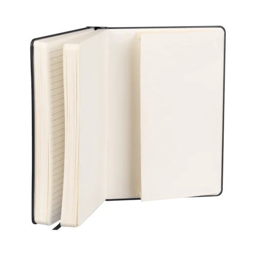 Cuaderno tamaño A5 modelo "ROMA", con tapa dura de cartón piedra de 2.0mm forrado en Eco-Cuero PU. Contiene 192 finas hojas lineadas amarillas FSC IVORY PAPER de 80g/m2 + 4 hojas de 140g/m2 con 1 bolsillo interior en la última hoja. Contiene elástico para cierre de 8mm de ancho y banda separador de hojas al tono de 6mm de ancho. Presentación en fina caja con tapa de regalo de cartón piedra de 2.5mm forrado en papel al tono de 80g/m2.