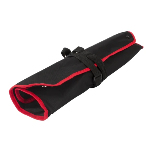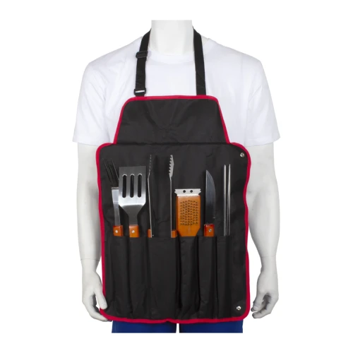 Delantal de tela raquelada negra con 9 prácticas herramientas para asado. Plegable y transformable en bolso. Fácil para bordar o imprimir.