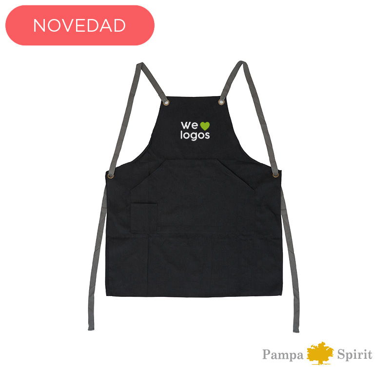 El delantal de Pampa Spirit está confeccionado en tela 50% polyester, 50% algodón,. Incluye un bolsillo grande principal, un bolsillo pequeño y un destapador de botellas.