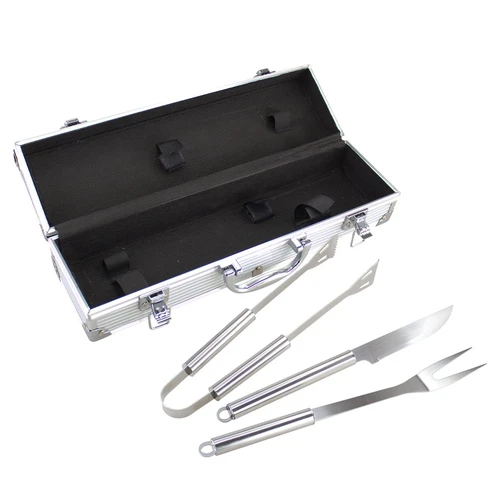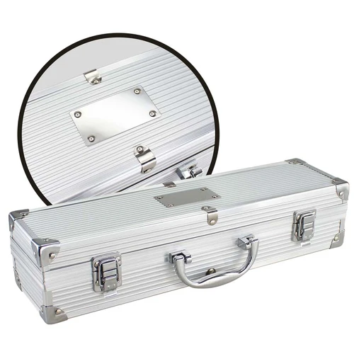Deluxe BBQ set de asado en caja metálica. Incluye 3 herramientas de asado 100% acero inoxidable: cuchillo, tenedor y tenazas. Interior recubierto en tela ecológica negra. Manilla y cierres metálicos. Incluye placa metálica rectangular para grabar logo. Presentación bubble-bag + elegante caja de cartón laminado plateado.