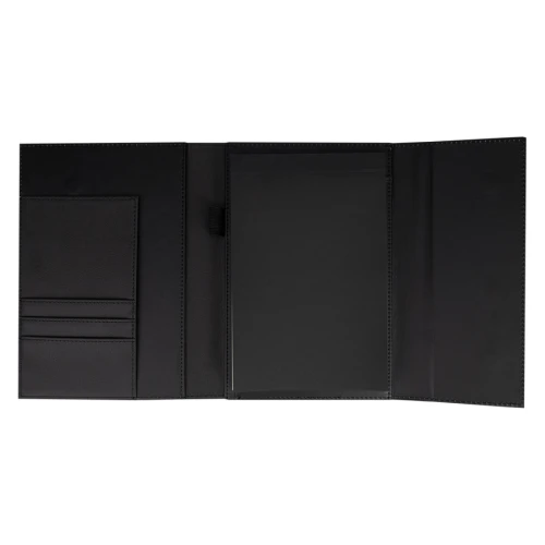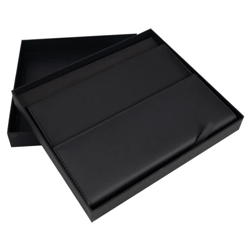Libreta de Apuntes con 50 hojas lisas amarillas de 13.5 x 20.5 cm., presentada dentro de fina carpeta de PU negro con interior porta-documentos, porta-bolígrafo y cierre imantado, protegida por lámina de tela no tejida color negro. Presentación en elegante caja de cartón piedra esmaltado negro y funda de papel negro. Un gran regalo para nivel ejecutivo.