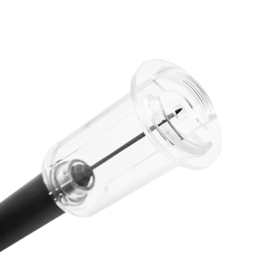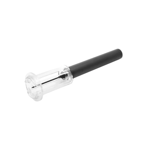 Sacacorchos neumático con caja contenedora. Se clava la aguja al corcho y se da presión al interior de la botella hasta que el corcho sale sin hacer fuerza. Medidas: Largo 19 cm.
