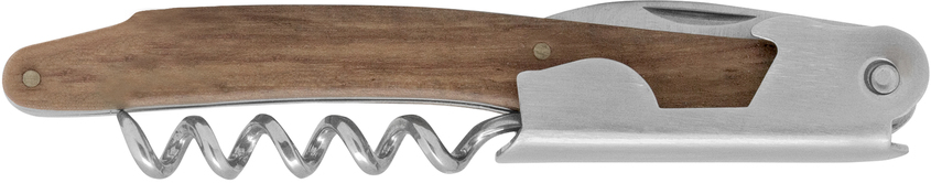 11,6 cm. Acero inoxidable. Peso: 68g. Abridor de botellas de vino en acero inoxidable con mango de madera en color natural. Accesorios incorporados: sacacorchos, navaja y destapador. Presentación en caja de regalo Kraft.