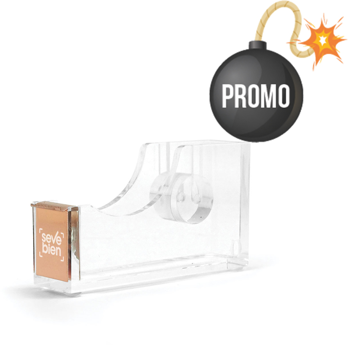 11,5 x 6,4 x 3 cm. Acrílico y metal rose gold. Dispensador de cinta adhesiva que combina disen?o y funcionalidad para el di?a a di?a. Presentación en caja de regalo.