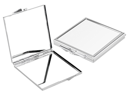 Espejo metálico cuadrado doble, con tapa, con cuadrado para Sublimación. Presentación en caja laminada blanca.