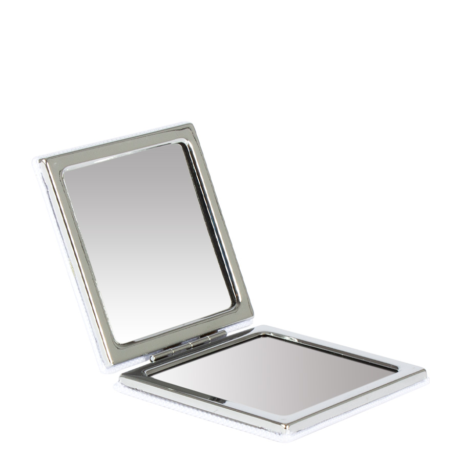 Espejo metálico cuadrado doble, con 2 tapas exteriores recubiertas en poliéster color blanco, para Sublimación. Contiene un espejo normal y el otro con aumento. Sistema de cierre magnético. Presentación en bolsa PP translúcido.