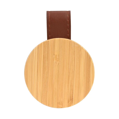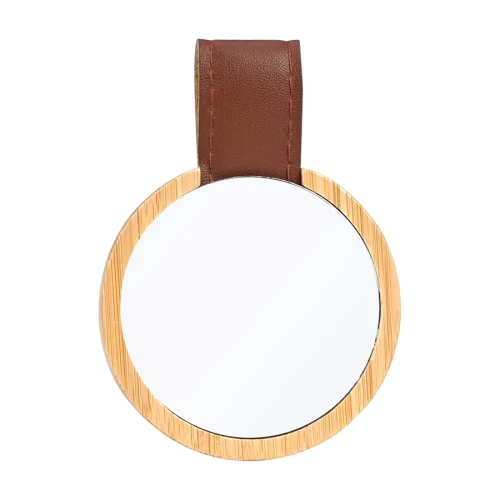 Espejo redondo con cuerpo de madera de Bamboo y correa de Eco-Cuero café.