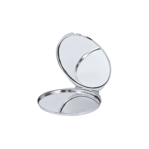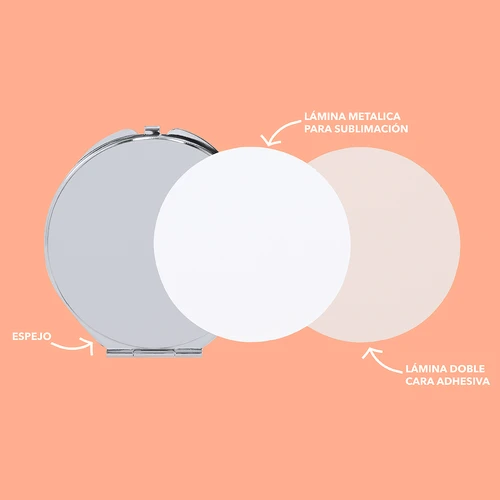 Espejo plegable metálico con placa para sublimación (no integrada en el producto, ideal para imprimir y pegar posteriormente). Con dos espejos interiores: 1X y aumento 2X.