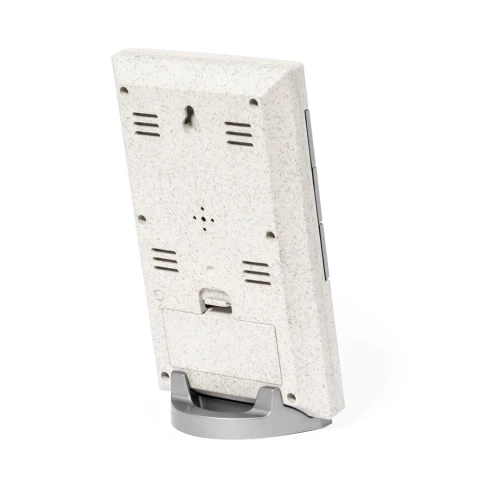 Estación meteorológica fabricada en caña de trigo, con termómetro e higrómetro. Función de hora, calendario, alarma y día de la semana, fácilmente visibles en la pantalla retroiluminada. Con base soporte y enganche para colgarlo. Alimentación a pilas (2xAAA no incluidas) y presentada en atractiva caja de diseño kraft. Disponible manual de instrucciones en español e inglés.La caña de trigo fomenta la utilización de materias primas naturales, reduciendo así las emisiones contaminantes.