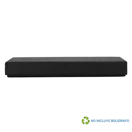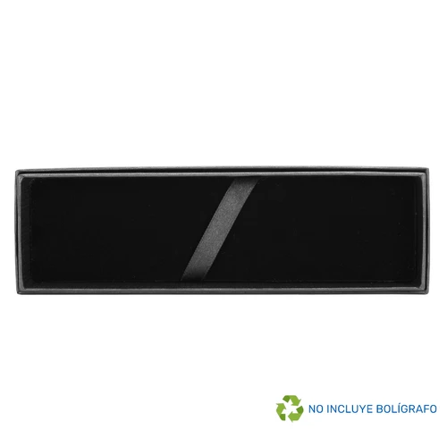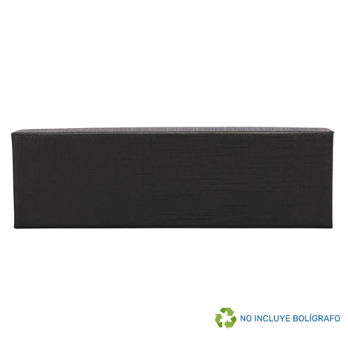 Estuche rectangular Porta-Bolígrafo ejecutivo modelo "TAURUS", con tapa. Fabricado en cartón forrado color negro, con base interior acolchada en tela negra afelpada y cinta sujeta-bolígrafo de poliéster. 100% color negro.