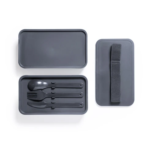 Fiambrera de 1,4 l de capacidad, fabricada en PP libre de BPA. Dos compartimentos, cada uno de 700 ml de capacidad. Compartimentos interiores con tenedor, cuchara, cuchillo y separadores. Disponible en variada gama de colores, con cinta elástica de seguridad a juego. Certificación Food Grade, garantizando la seguridad cuando los alimentos entran en contacto con el material usado para fabricar el producto.
