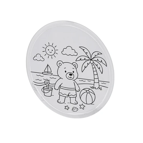 Original frisbee fabricado en Non-Woven. Divertido conjunto de 5 ceras y frisbee con zona para poder colorear el original dibujo de osito en playa.