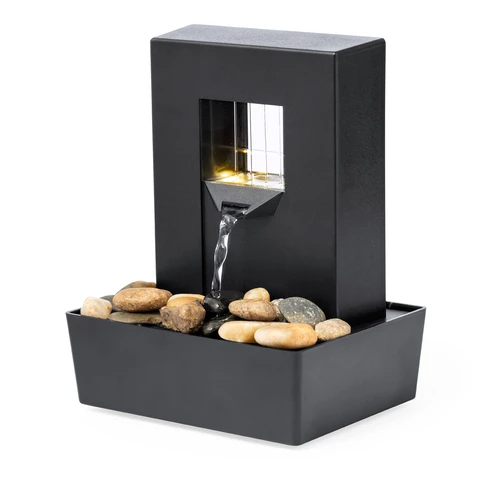 Fuente portátil de agua infinita con luces LED. Cascada de agua sobre piedras naturales, ideal para decoración o momentos de relajación. Incluye un depósito para el agua y una estructura iluminada por LEDs de tonos naturales, a través de la que fluye el agua. Alimentada por 3 pilas AA (no incluidas). Presentada en caja de diseño kraft.
