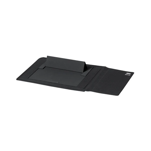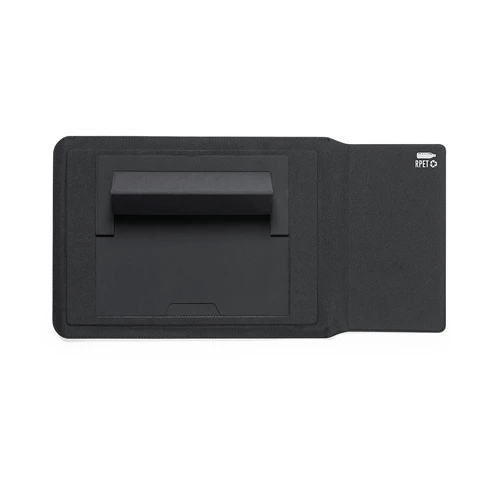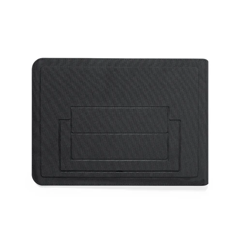 Funda de ordenador fabricada en poliéster 600D RPET, elaborado a partir de plástico reciclado, para así fomentar la reutilización de residuos plásticos y ayudar a la sostenibilidad del planeta. Con cierre magnético y distintivo RPET. Interior desplegable con alfombrilla para ratón y soporte inclinado para ordenador. Presentado en caja individual de diseño.