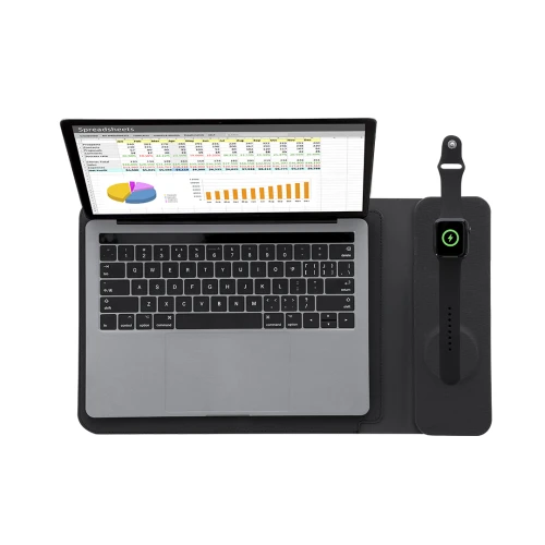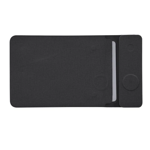 Funda de Ordenador Portátil Multifunción fabricada en PU Reciclado y tejido RPET. Para ordenadores de hasta 13 pulgadas y equipada con sistema de carga inalámbrica multifuncional. Incorpora 2 cargadores: cargador inalámbrico magnético para reloj inteligente, ubicado en la parte superior y, cargador inalámbrico magnético para móvil y/o auriculares en la parte inferior. Con sistema de cierre magnético.