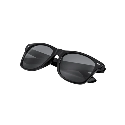 Gafas de sol de línea nature con protección UV400. Montura y patillas en RPET, elaborado a partir de plástico reciclado para así fomentar la reutilización de residuos plásticos y contribuir a la sostenibilidad del planeta. Lentes AC (acetato de celulosa) en color negro, disponibles en variada gama de colores. Presentada en atractiva bolsa de diseño eco.