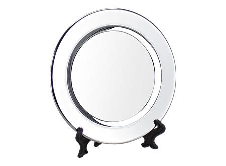 Galvano Plato de Acero inoxidable cromado tamaño pequeño, con circunferencia metálica para Sublimación. Presentación en bolsa plástica.