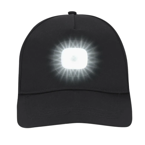 Gorra de 5 paneles en suave poliéster con linterna extraible. Ajustable cierre de velcro y orificios de ventilación bordados. Linterna con 4 LEDs e intensidad regulable con tres intensidades y botón en el frontal de encendido y apagado. Se puede extraer para cargar a través de USB. Batería de 200 mAh. Ideal para actividades al aire libre.