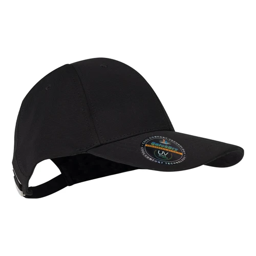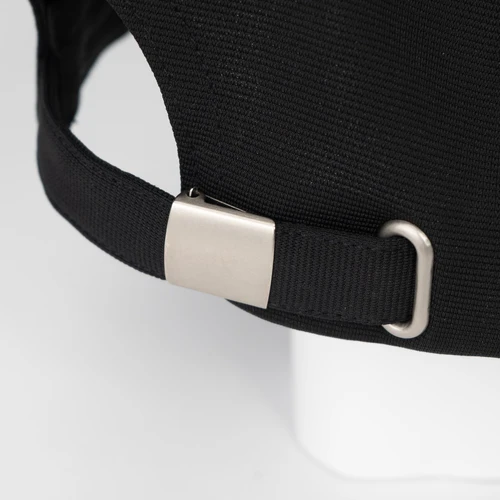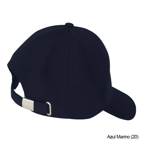 Gorro tipo Jockey de poliéster, con protección UV UPF 50+, con traba metálica plateada y pasador metálico posterior.