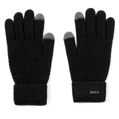 Práctico par de guantes para dispositivos con pantalla táctil. De cálido y suave acabado poliéster RPET. Función táctil en dedos índice y pulgar. Talla única adulto, con logotipo RPET en etiqueta exterior.El material RPET se elabora a partir de plástico reciclado, para así fomentar la reutilización de residuos plásticos y ayudar a la sostenibilidad del planeta.