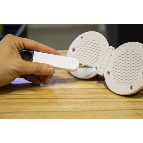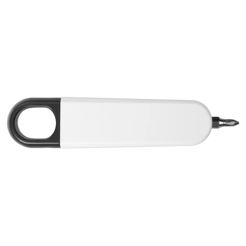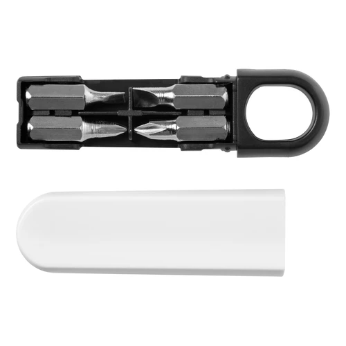 9 x 2 x 1,5 cm. Plástico. Herramienta destornillador con 4 puntas intercambiables que se guardan en el interior. El extremo de la tapa es imantado para el ajuste de las puntas.