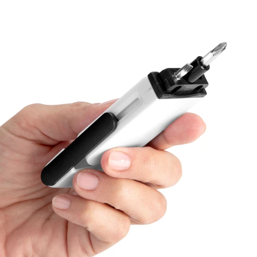 Todo en uno, siempre a manoSet de destornillador con 2 puntas intercambiables ocultas (plana de 3,5 mm y cruz de 2mm.) Ambas en CR-V que las hace más durables y resistentes a la corrosión. Incluye cinta métrica de 1 m. con escalas en centímetros, pulgadas y pies. Cuerpo imantado para poder fijar las puntas. Apertura por deslizamiento.Medidas: 9 x 3,8 x 1,4 cm.