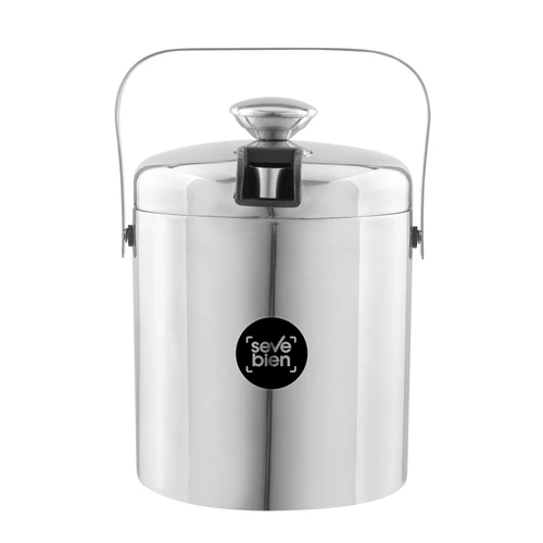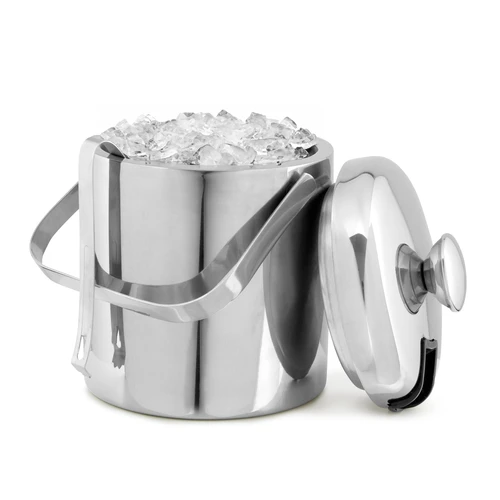 Ø 14 x 14 cm. Capacidad 1100 ml. Acero inoxidable. Interior en acero 304 y exterior en acero 201. Hielera de mesa con tapa. Pinza para hielo de acero inoxidable, encastrable en la misma tapa. Asa de acero inoxidable para transportar. Presentación en caja de regalo kraft.