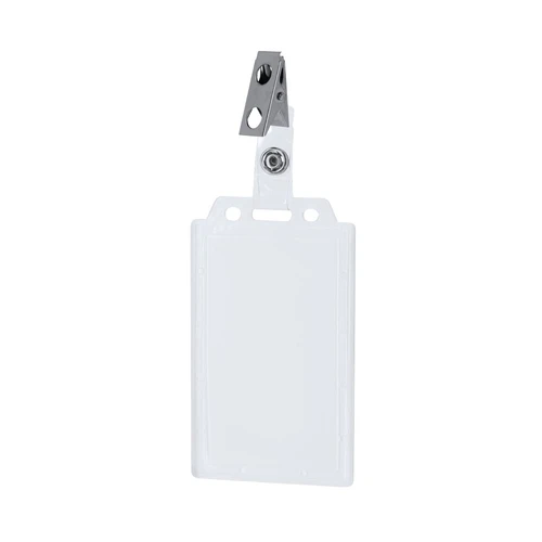 Identificador de PS rígido con pinza metálica en orientación vertical. Ideal para llevar colgado y mostrar tu identificación. El sistema de cierre es extraíble y puedes utilizar el identificador en conjunto con lanyard.