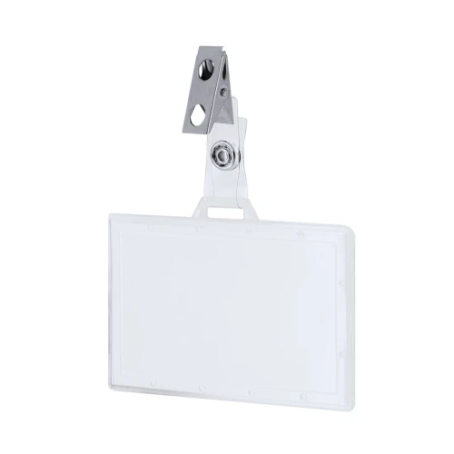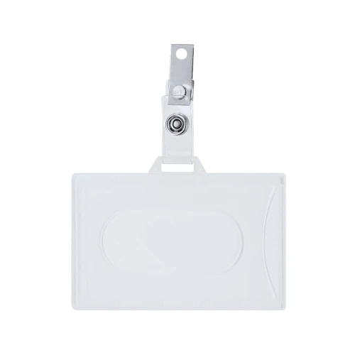 Identificador de PS rígido con pinza metálica en orientación horizontal. Ideal para llevar colgado y mostrar tu identificación. El sistema de cierre es extraíble y puedes utilizar el identificador en conjunto con lanyard.
