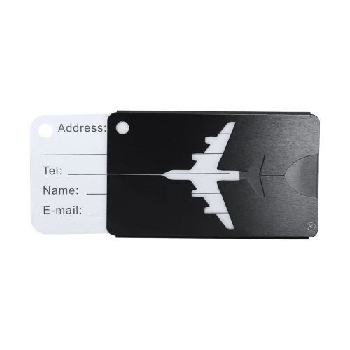 Original identificador de maletas con diseño de avión en resistente Aluminio Reciclado. Con cinta de acople en acero inoxidable con sistema de cierra en rosca y tarjeta de identificación en inglés con los siguientes campos impresos; Addres, Tel, Name, E-mail. Logo AL Recycled grabado por láser.