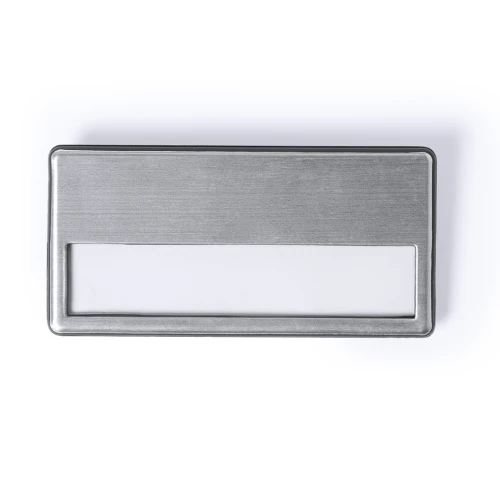 Identificador en acabado brillante. Parte trasera con doble sistema de fijación -pinzas de enganche metálicas e imperdible- para un ajuste seguro.