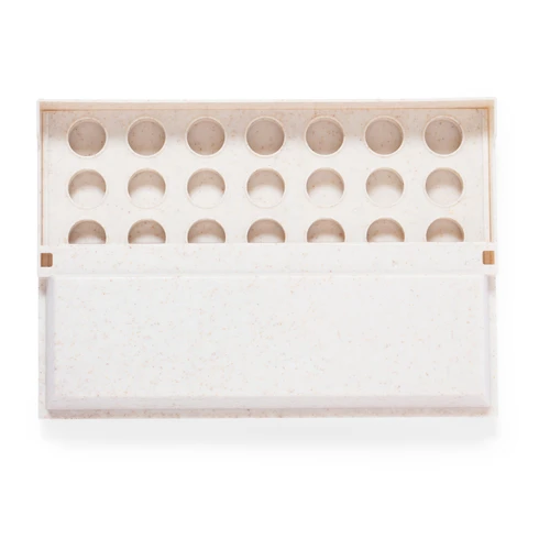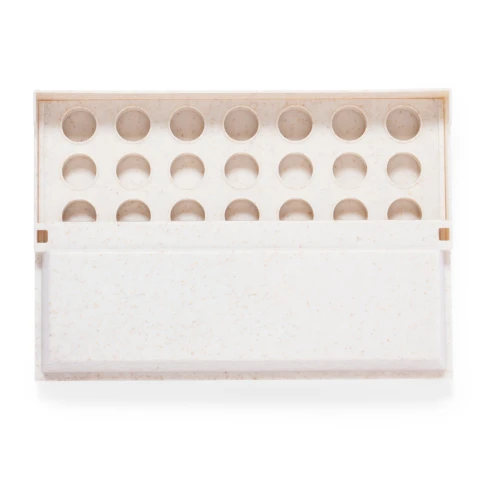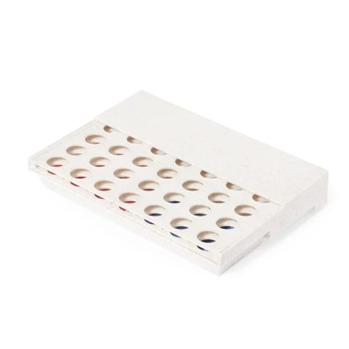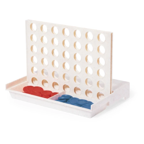Divertido juego de mesa fabricado en caña de trigo. Compuesto por un tablero vertical y 42 piezas circulares (21 rojas y 21 azules). Emoción para todas las edades introduciendo las fichas por las ranuras para conseguir 4 fichas en 1 misma fila. Fácil de montar por su tablero móvil pudiendo desplegar o plegar. Presentado en caja de diseño kraft.