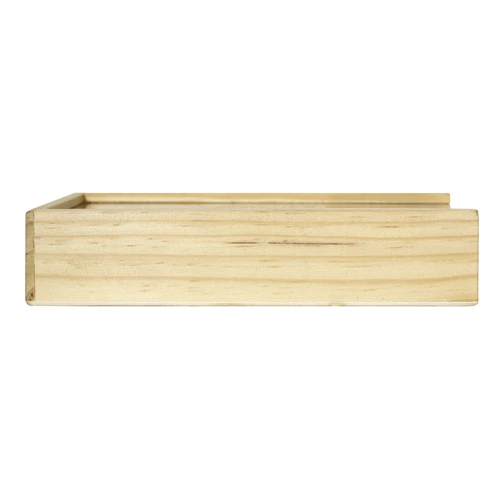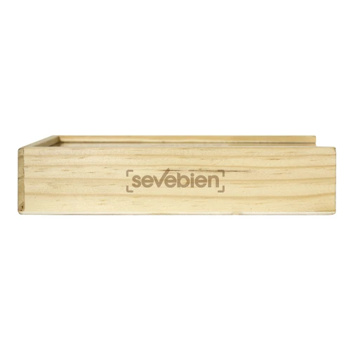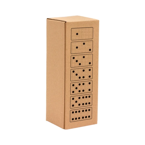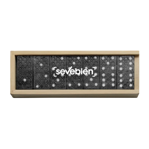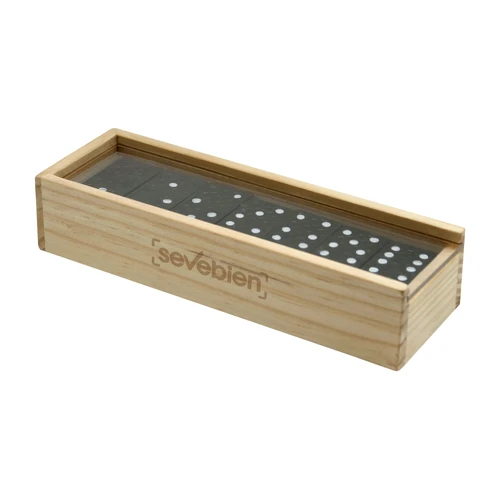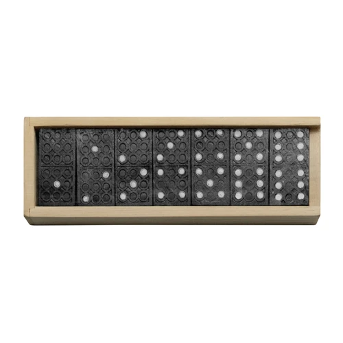 15 x 5 x 3 cm. Madera y plástico. Juego de dominó con 28 piezas de madera pintadas de negro, caja de madera y tapa plástica transparente. Manual de instrucciones dentro de la caja. Presentación en caja de regalo.