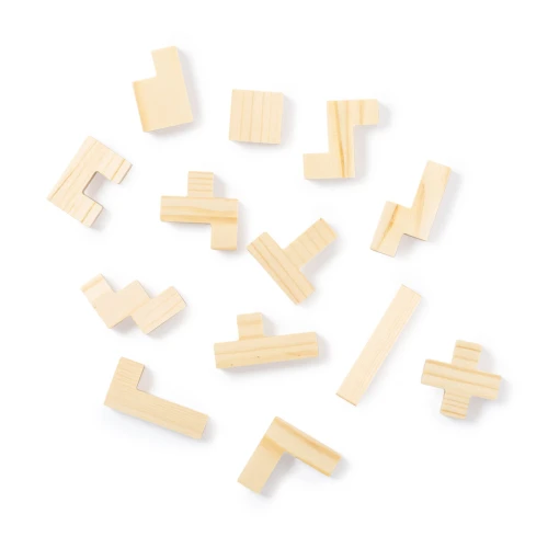Juego de habilidad fabricado en resistente madera. Con 13 piezas en caja de madera con tapa. Presentación en caja individual de diseño kraft.