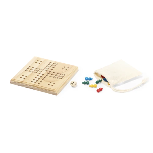 Entretenido juego de parchis fabricado en madera. Contiene un tablero, 16 fichas de 4 colores diferentes y un dado. Para participar entre 2 y 4 jugadores. Con práctica bolsita de algodón para guardar las fichas. Presentado individualmente en caja de diseño kraft.