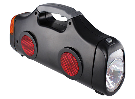 Kit de Emergencia para el Vehículo en plástico ABS negro. Incluye 13 Herramientas, Linterna, Luz naranja intermitente, 2 focos reflectantes redondos rojos y un cargador para conexión al encendedor del vehículo.