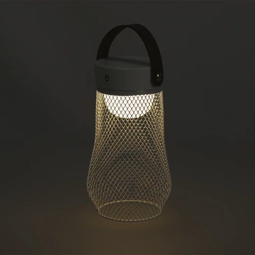Lámpara de diseño en metal. Incluye asa superior en suave PU. Dispone de 3 modos de luz (blanca, neutra y cálida). Equipada con 24 LEDs. Ideal tanto para espacios interiores como exteriores. Botón táctil integrado para encendido, apagado y la selección del modo de luz. Equipada con batería recargable de 1.200 mAh y entrada Tipo C.