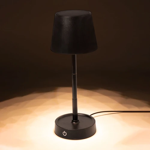 Lámpara de diseño en acabado negro mate. Incluye sistema de regulación de intensidad de luz táctil y con cuerpo plegable para ajustarlo en altura. Equipada con batería de 800mAh recargable por USB Tipo C -cable incluido- y 12 LEDs de luz cálida. Con botón encendido/apagado en la parte trasera.