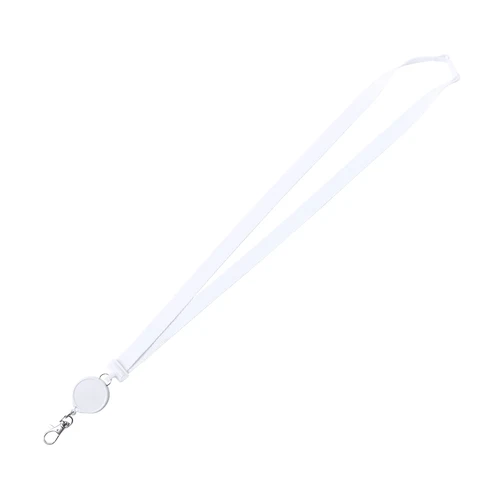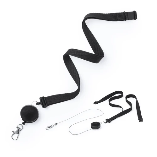 Práctico lanyard en poliéster con accesorio extensible. Accesorio de seguridad en el cuello y accesorio retráctil extensible con clip de ajuste en un lado, dejando el otro lado libre para el logotipado. Mosquetón metálico. Conjunto disponible en colores blanco y negro.
