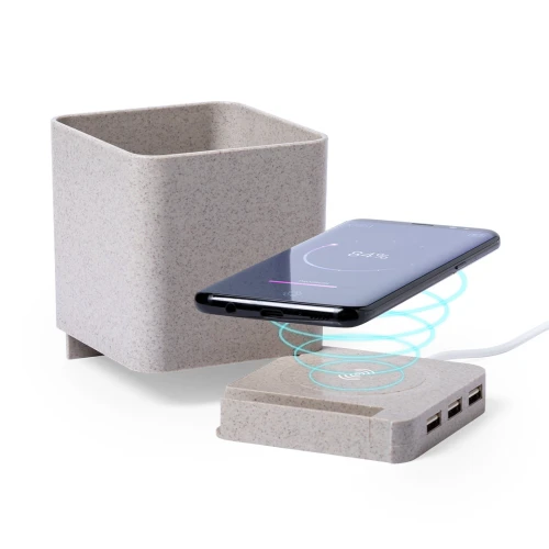 Lapicero multifunción 4 en 1 de línea nature. Carcasa en caña de trigo, para así fomentar la utilización de materias primas naturales y reducir las emisiones contaminantes. Con funciones lapicero, soporte para smartphone, cargador inalámbrico y puerto USB (3xUSB 2.0). Compatible con smartphones con tecnología de carga inalámbrica, incluye cable micro USB en color blanco de 1 metro de largo. Presentado en atractiva caja de diseño eco. Disponible manual de instrucciones en español e inglés.