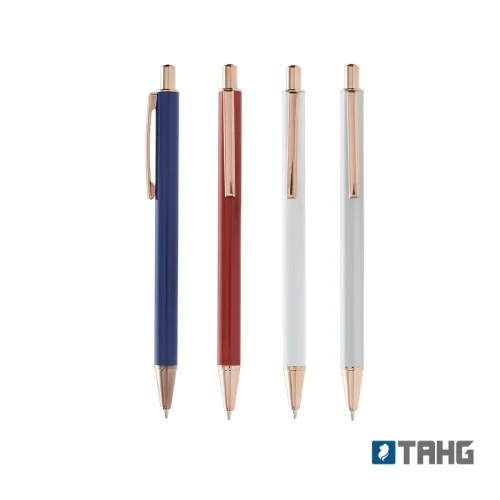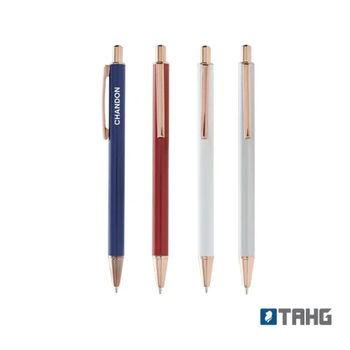 Lápiz de cuerpo de aluminio con detalles en tono cobre. Tinta color azul. Sistema de apertura retractil