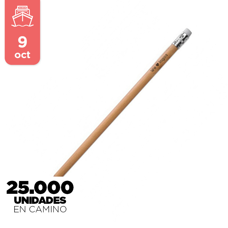 Lápiz grafito con goma. Realizado en madera con detalle de aluminio en reborde de goma. Material de la goma: Caucho. Punta sin preafilar. Medidas: 189 mm x Diámetro 0,8 mm. Mina: 2mm.