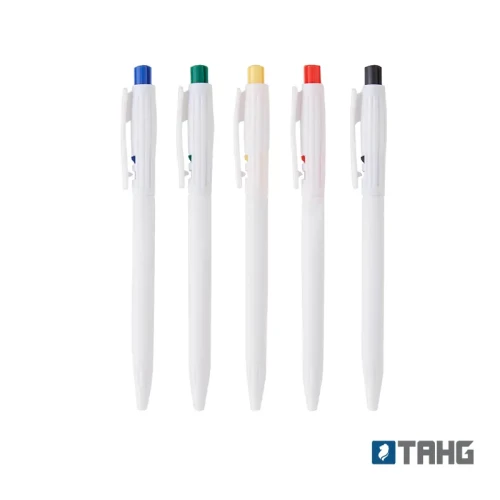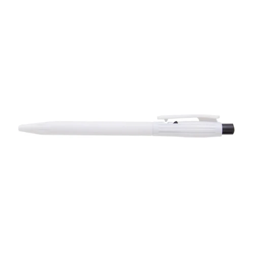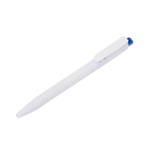 Lápiz confeccionado en ABS, de cuerpo de color blanco y clip en color. Apertura con pulsador. Tinta Azul