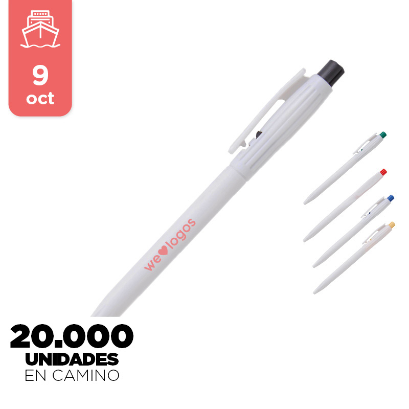 Las fechas, precios en portada y entregas son estimativas y están sujetas a cambios. Lápiz confeccionado en ABS, de cuerpo de color blanco y clip en color. Apertura con pulsador. Tinta Azul.