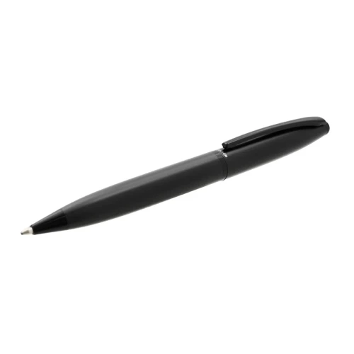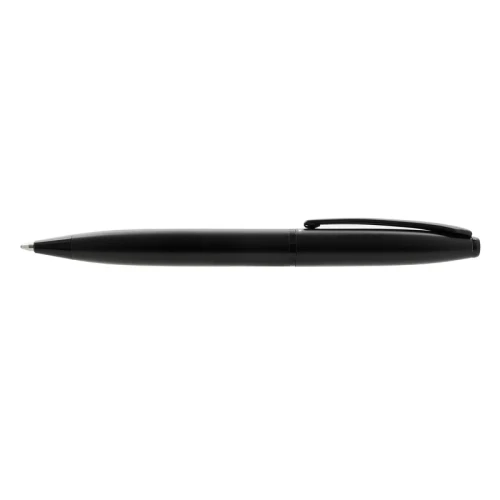 Lapiz de cuerpo metálico en acero con detalles en negro mate. Cuenta con tinta azul y apertura con medio giro. Medidas: 13,8 x 1,25 cm. Roupen.