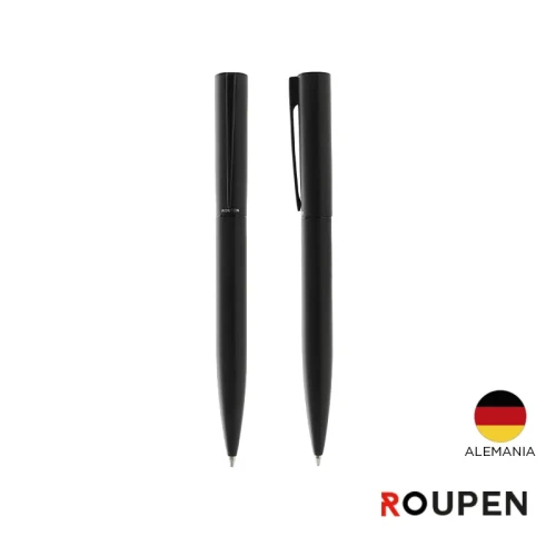 Lapiz de acero con detalles en latón, acabado negro mate. Dimensiones: 13,6 x 1,25 cm. Cuenta con tinta azul. Roupen.