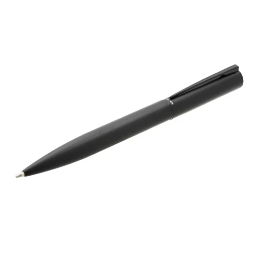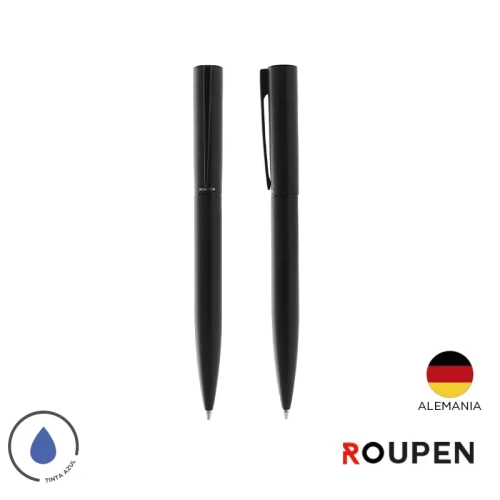 Lapiz de acero con detalles en latón, acabado negro mate. Dimensiones: 13,6 x 1,25 cm. Cuenta con tinta azul.